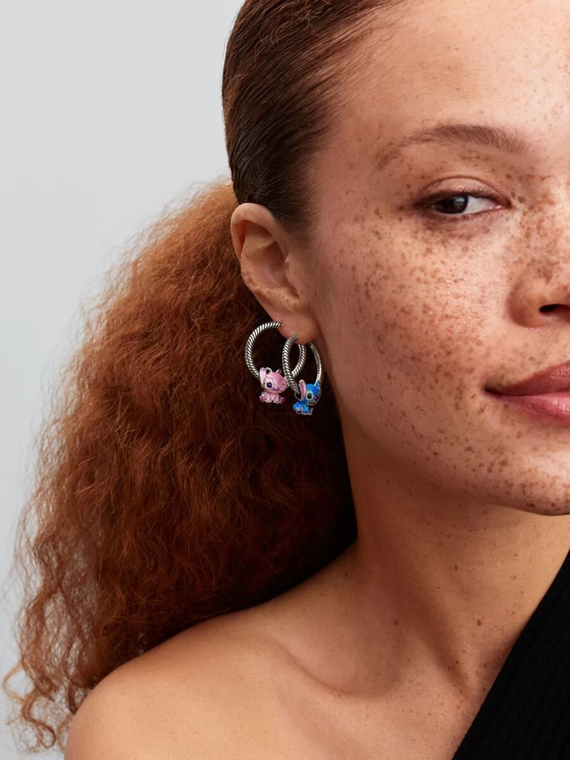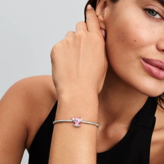 Feiere die Magie von Disney mit dem Disney Lilo & Stitch Engel Charm aus Sterling-Silber mit violetter und rosafarbener Emaille. Dieses bezaubernde Disney x Pandora Schmuckstück zeigt einen zwinkernden Engel von Lilo & Stitch und verleiht deiner Sammlung einen Hauch verspielter Eleganz.