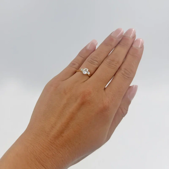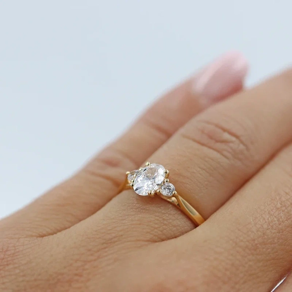 Der Eterna 21 in Gold trägt im Zentrum einen oval geschliffenen Diamanten von 0,70 Karat, dessen längliche Form das Licht auf prachtvolle Weise reflektiert. Zwei seitliche Brillanten von je 0,07 Karat verstärken den Schimmer und machen den Ring zu einem eleganten Symbol ewiger Liebe. Die schlichte, 2 mm breite Schiene mit abgerundeter Innenseite sorgt für Tragekomfort und zeitlose Eleganz.