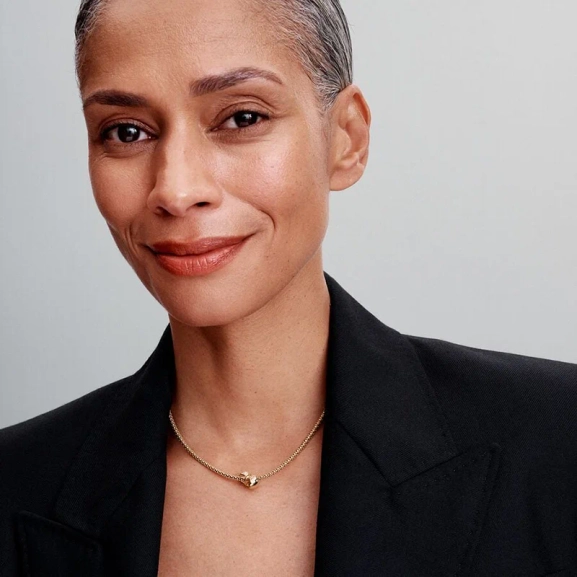 Brillante Steine und Pavé glänzen auf einer warmen Gold-Plattierung in Form einer klassischen Schleife.