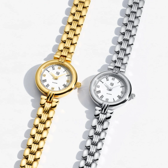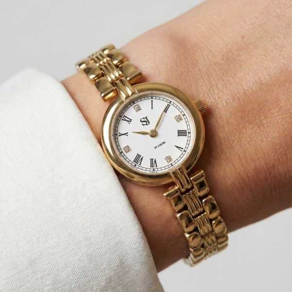 Eine goldfarbene Armbanduhr mit klassischem Zifferblatt und dekorativen Details. Ihre zeitlose Form macht sie zu einer eleganten Wahl, die Ihren Alltag mit dezentem Luxus bereichert.