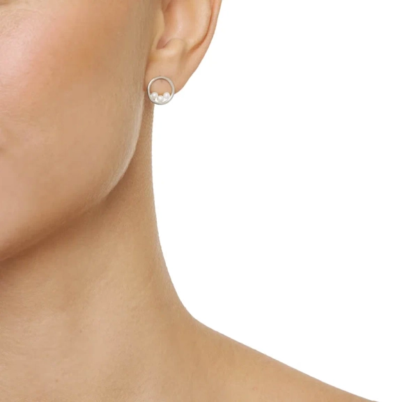 Kleine silberne Kreise mit drei Süßwasserperlen in jedem Ohrring. Ein verspieltes und elegantes Design, das dem Gesicht einen subtilen Glanz verleiht.