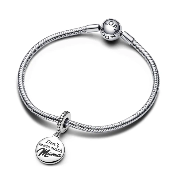 Lerne den Mama Gravierbarer Charm-Anhänger kennen – ein Schmuckstück aus Sterling-Silber, das die Mutterschaft mit einem Hauch von Humor feiert. Dieses Pandora Charm hat eine runde Scheibe mit der Gravur „Don’t mess with Mama.“ Die einzigartige Note des Charms liegt in der mit Emaille gefüllten „Mama“, die ihm einen Hauch von Schwarz verleiht. Der Verbindungsring ist mit erhabenen Herzen und Linien verziert. Was macht es so besonders? Die Rückseite ist bereit für deinen persönlichen Touch mit einer personalisierten Gravur, die es noch einzigartiger macht. Verschenke es als besonderes Zeichen für deine Mutter als verspielte Hommage an die Freuden der Mutterschaft.