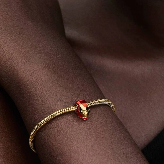 Iron Mans legendärer Helm ist mit 14 Karat Gold überzogen. Mit leuchtend rotem Emaille und im Dunkeln leuchtenden Augen symbolisiert er Transformation und Widerstandsfähigkeit. Perfekt, um jedem Look eine heroische Note zu verleihen.
