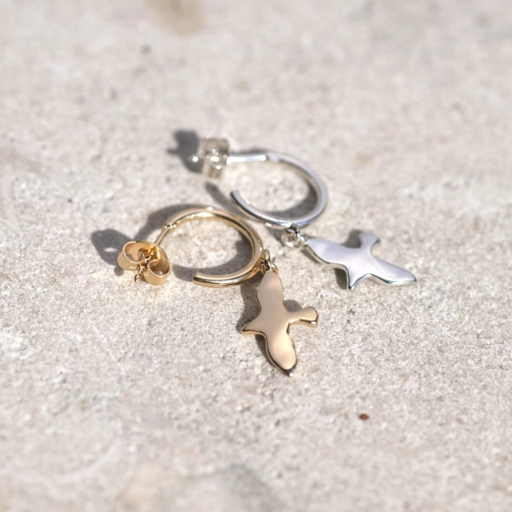 In diesem eleganten Ohrringdesign von Emma Israelsson symbolisiert eine kleine Taube Hoffnung und Freiheit. Gefertigt aus Silber, bestechen die sanft geschwungenen Linien durch einen natürlichen, organischen Ausdruck. Tragen Sie den Ohrring einzeln als dezentes Detail oder kombinieren Sie ihn mit anderen Lieblingsstücken für einen individuellen Look.