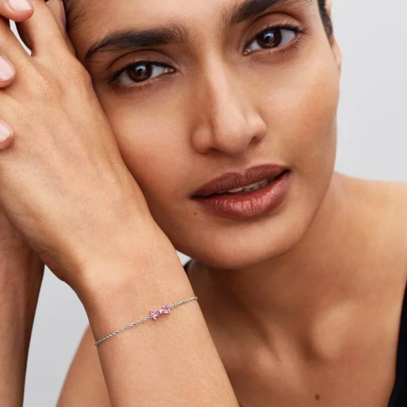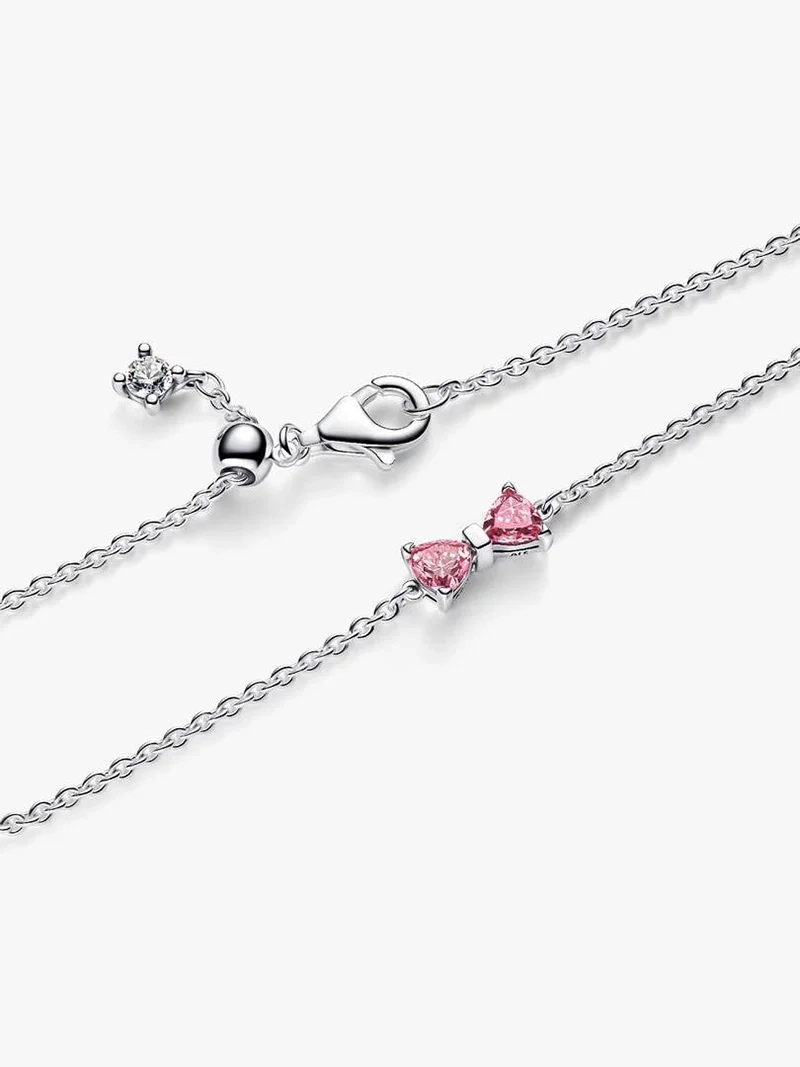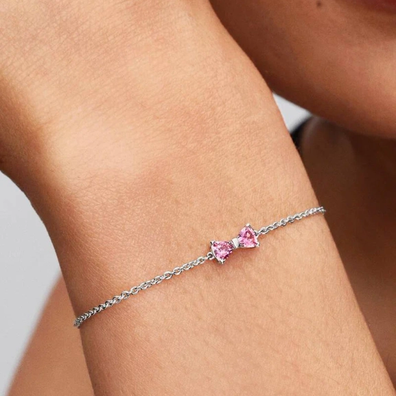 Vervollständigen Sie Ihren Look mit einer Schleife. Unser elegantes Armband aus Sterlingsilber ist mit rosa und klaren Zirkonia besetzt und verfügt über einen baumelnden Stein am Verschluss.