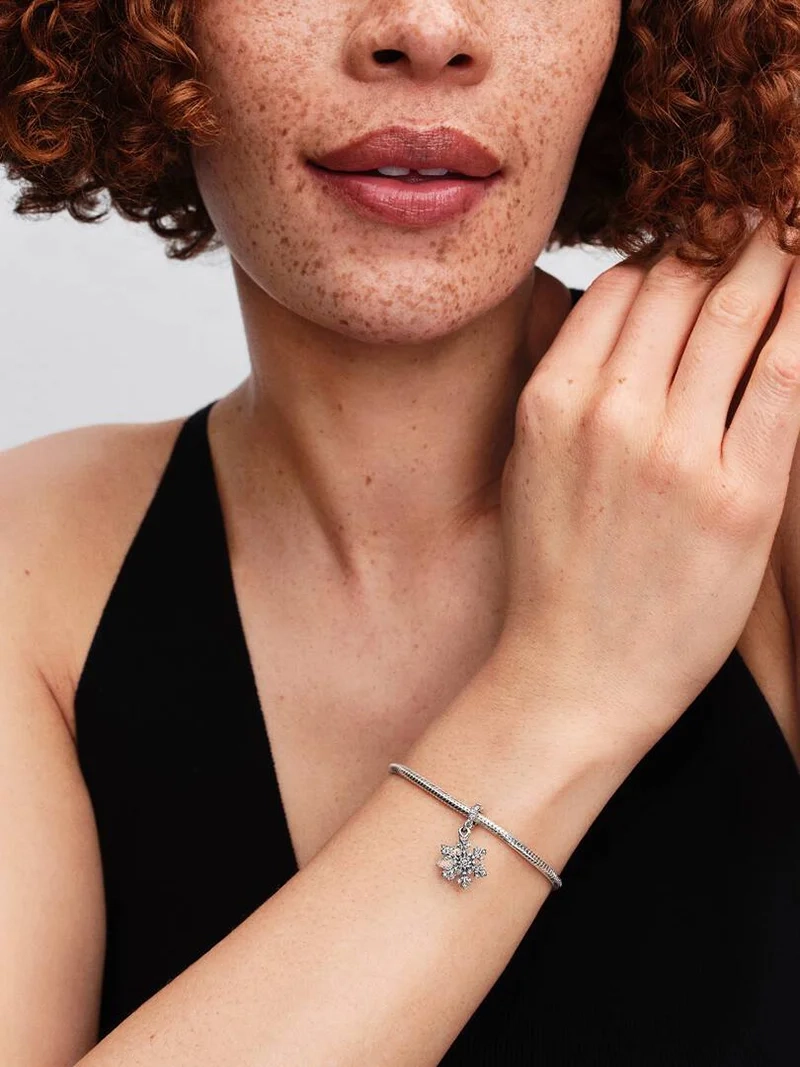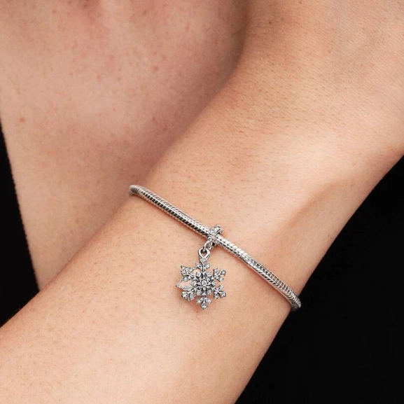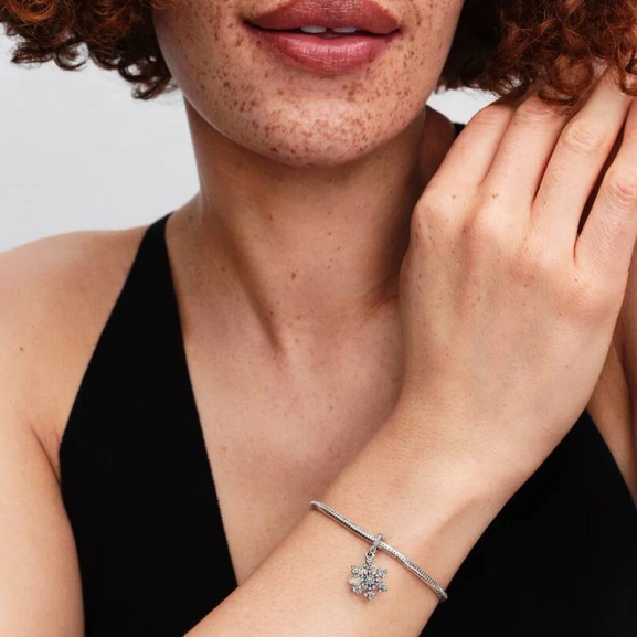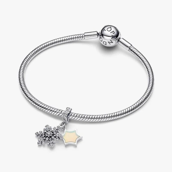 Vermitteln Sie die Wunder des Winters in Sterlingsilber. Dieser Charm kombiniert eine funkelnde Schneeflocke mit einem schimmernden Stern mit Polarlicht aus künstlichem Opalharz auf der einen Seite und der Gravur „I MELT FOR YOU“ auf der anderen.